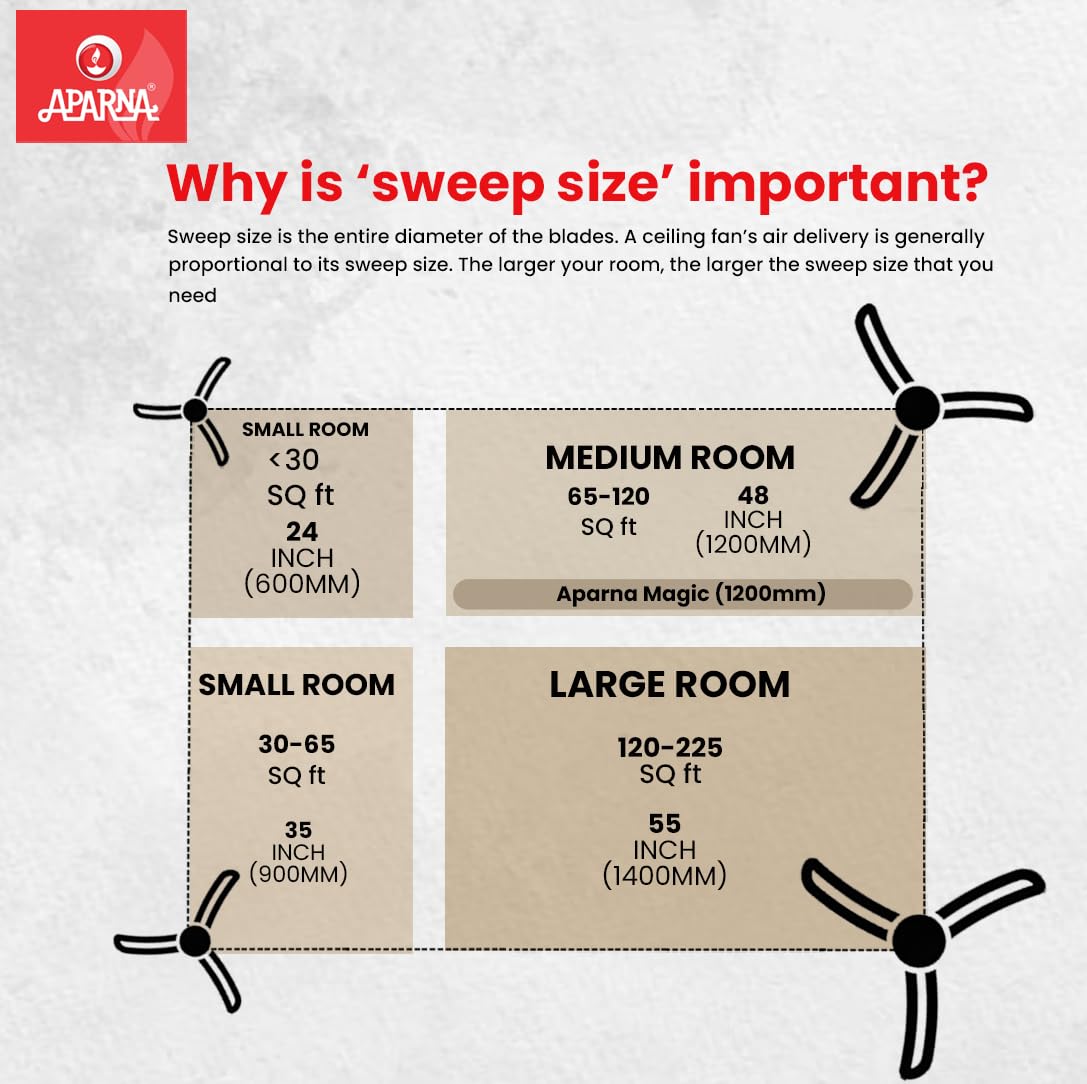 - High-speed ceiling fan with a 1200 mm (48 inch) sweep, ideal for small to medium sized rooms