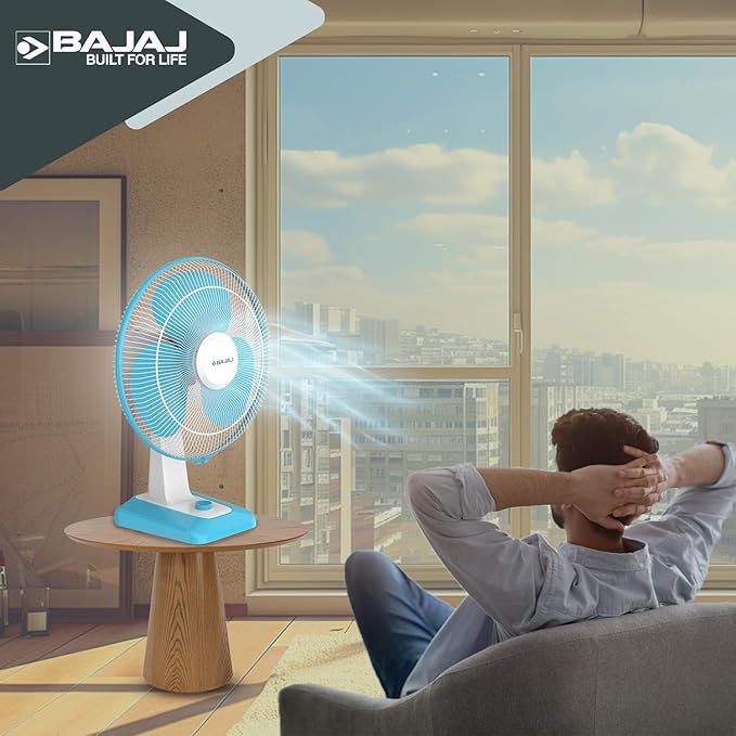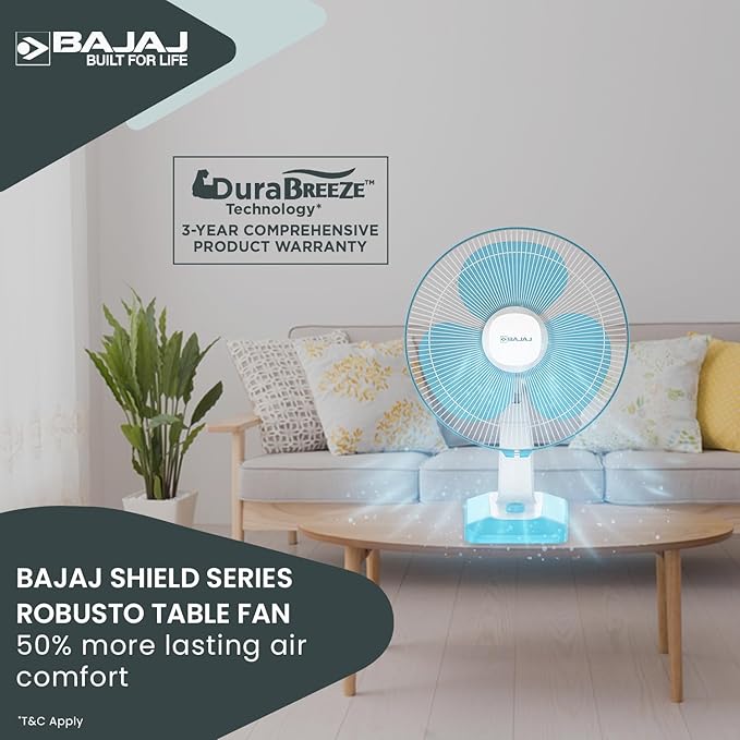 Bajaj Robusto 400MM Oscillating Table Fan For Home | DuraBreezeTM Technology | Surge Protection | 100% Copper Motor | High Air Delivery | Modern Décor | 3 Years Warranty【Icy Blue & White】