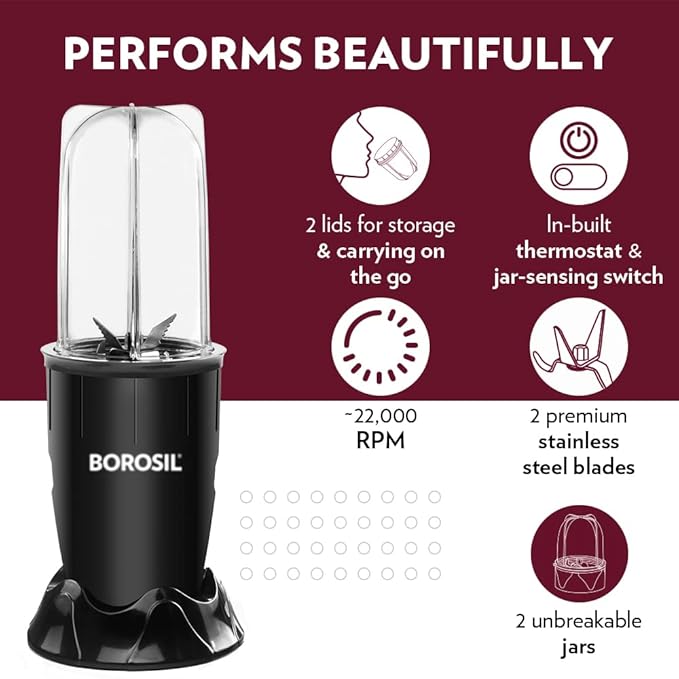 - MULTIFUNCTIONAL - Easy to assemble and use, the Borosil Nutrifresh blender and mixer Grinder is the prep appliance you'll reach out for in the kitchen. This must-have mixie for the kitchen comes with two unbreakable polycarbonate jars - a blending jar (which can be drunk from directly), and a smaller jar with a special blade for dry grinding whole spices (garam masala, jeera, etc) and delicious chutneys.