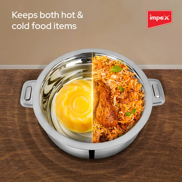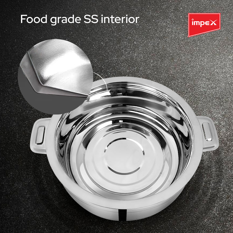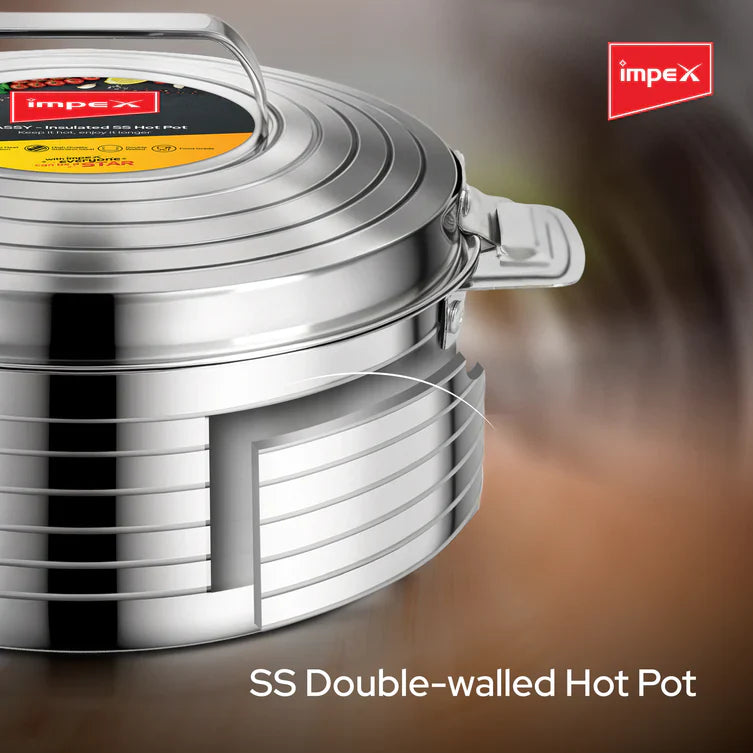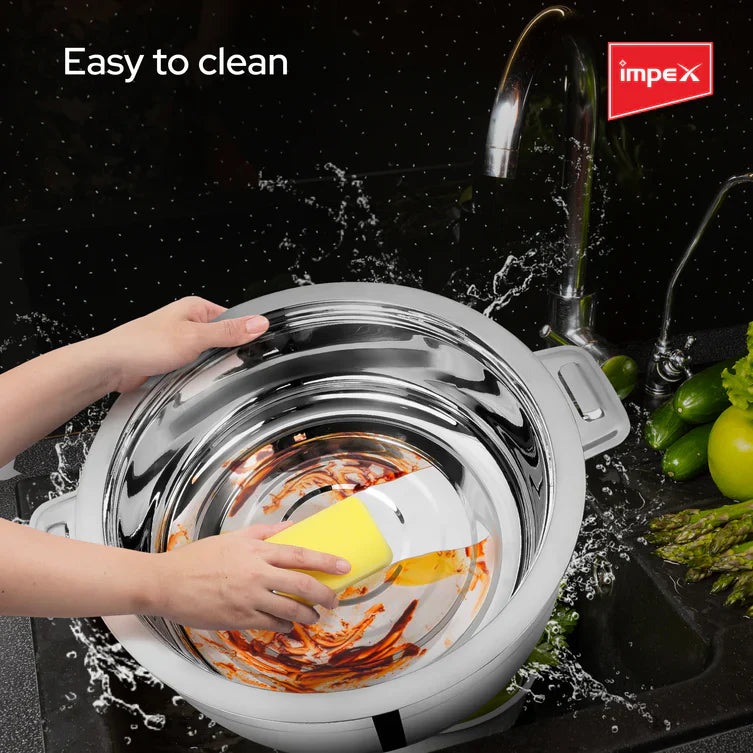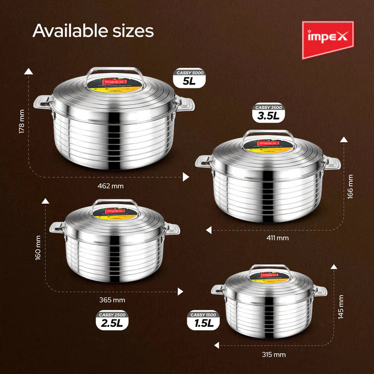 The Impex Cassy 2500 Stainless Steel Hotpot is crafted with high-grade stainless steel, offering durability and an attractive design. With a 2.5-liter capacity, this hotpot is perfect for keeping your food warm for longer durations. Its compact size and elegant silver finish make it an ideal addition to your kitchen or dining table. Dishwasher safe and easy to maintain, this product ensures convenience for everyday use.
