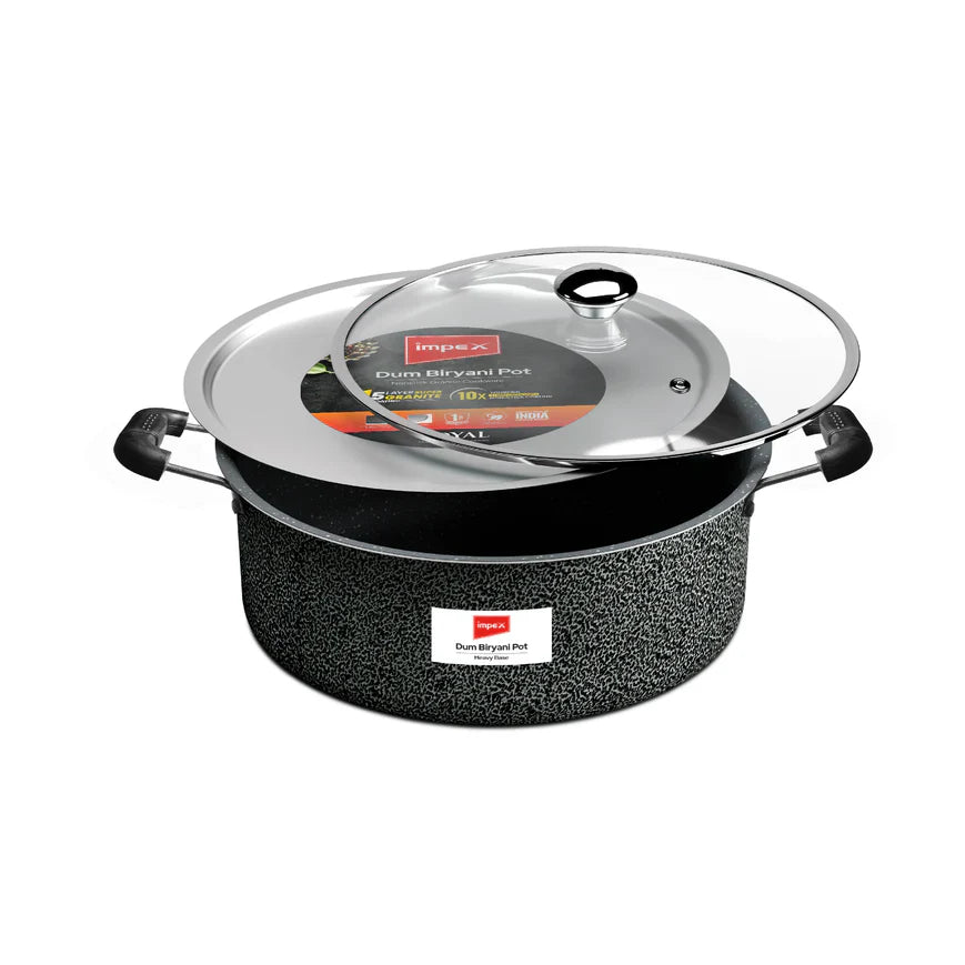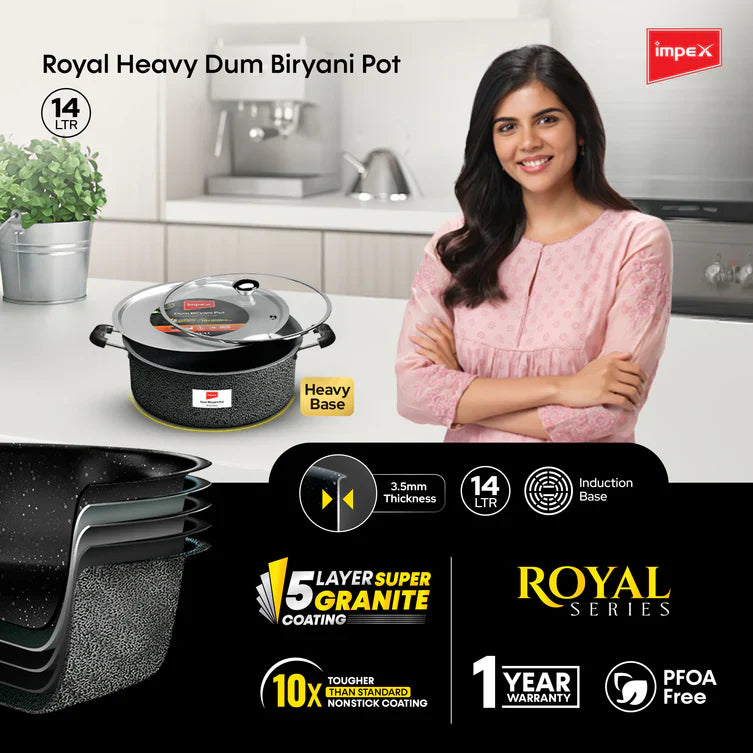 Introducing the Impex Dum Biriyani Pot HV Royal Series (RDBP14-HV), your ultimate companion for crafting the perfect biryani. Designed with premium quality aluminium, this 14-liter pot is built to deliver exceptional performance and durability. It features a high-grade 5-layer super granite coating, ensuring superior heat distribution and long-lasting non-stick properties.