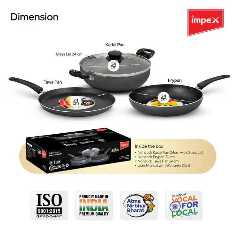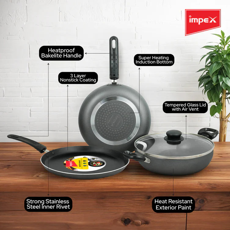 This premium cookware set by Impex features durable aluminium construction with a high-grade nonstick coating, making it perfect for a wide range of cooking applications. The set includes a Tawa, Frypan, and Kadai, each designed for efficient heat distribution and quick, even heating. The eco-friendly, PFOA-free coating, along with heat-resistant Bakelite handles, ensures safe and comfortable handling. Ideal for everyday cooking.