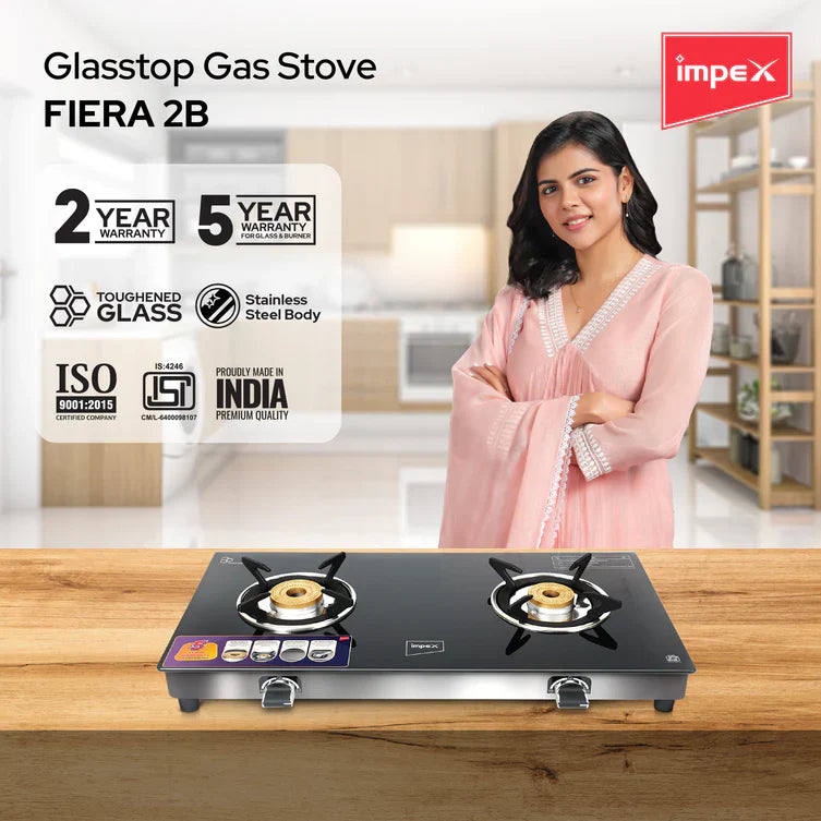 Introducing the Impex Glass Top Gas Stove SS FIERA 2B, a sophisticated addition to your kitchen crafted in India. With a sleek design and robust features, this gas stove enhances your cooking experience.