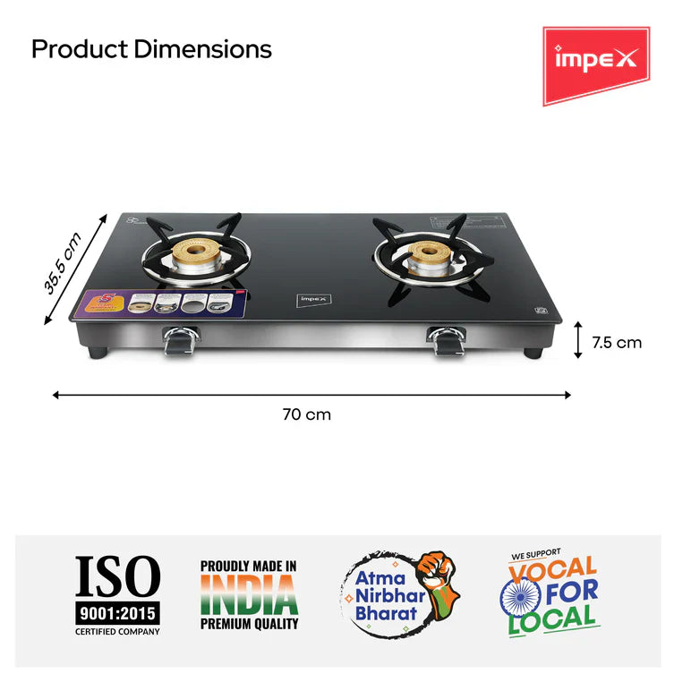 This Impex Gas Stove comes with a 2-year domestic warranty for the product and an extended 5-year warranty for the glass and burner. Elevate your culinary space with this reliable and stylish addition, suitable for LPG gas use.