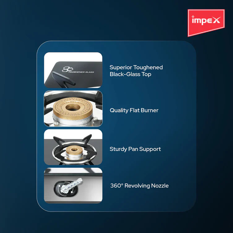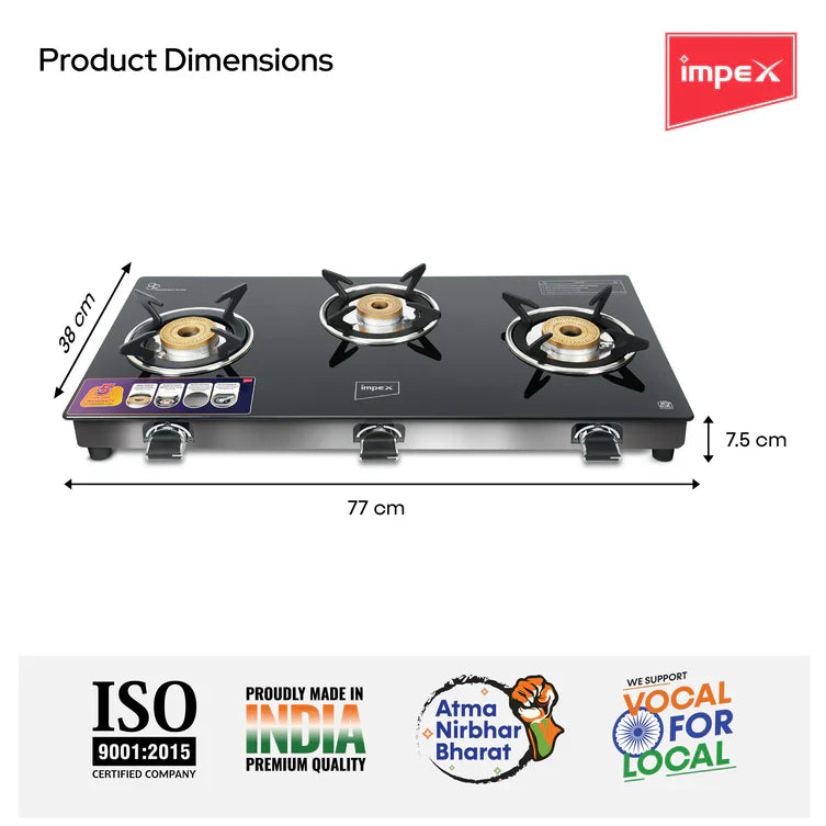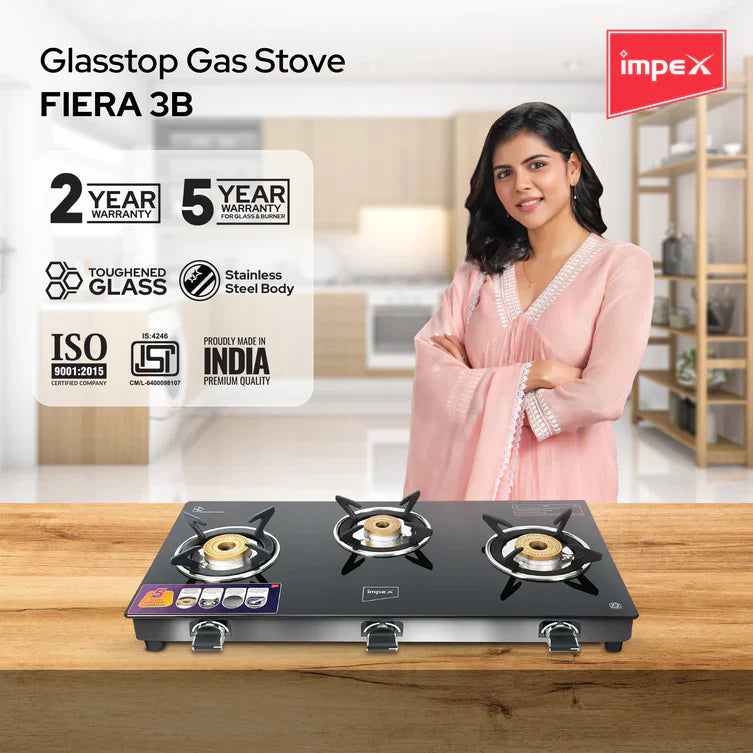 Introducing the Impex Glass Top Gas Stove SS FIERA 3B, a premium addition to your kitchen proudly crafted in India. With its stylish design and robust features, this gas stove elevates your cooking experience.