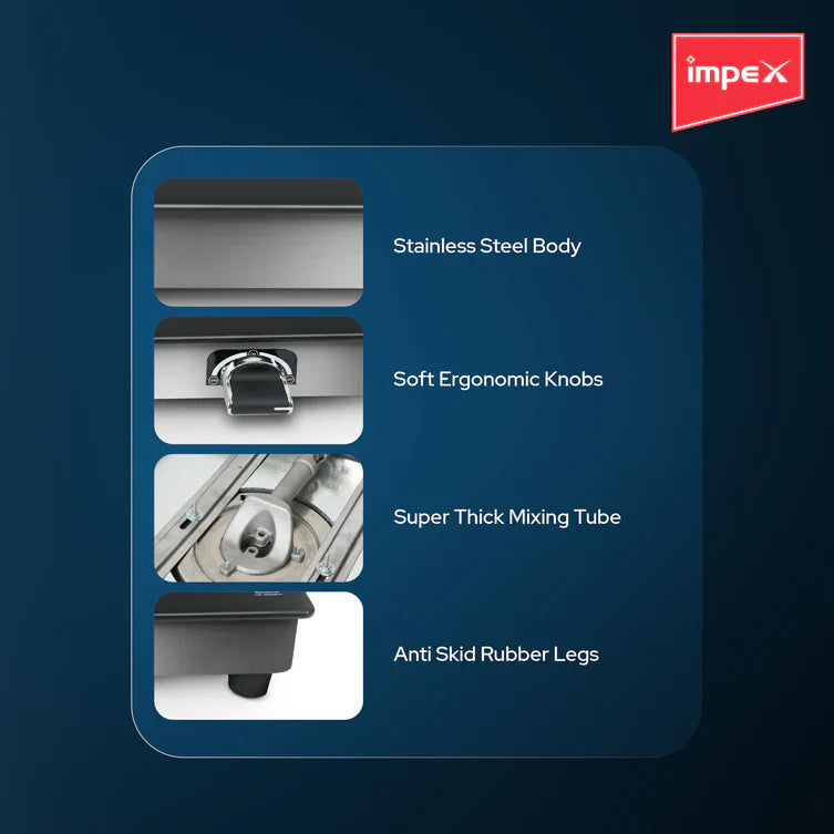 This Impex Gas Stove comes with a 2-year domestic warranty for the product and an extended 5-year warranty for the glass and burner, ensuring long-lasting performance. Elevate your culinary space with this reliable and stylish addition, suitable for LPG gas use.