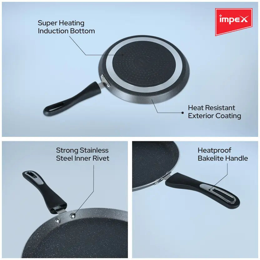 The Impex Alumuminum cookware comes with 5 layaer granite coated Nonstick tawa pan.This cookware will enable you to prepare a variety of healthy food while also giving your kitchen a sense of elegance.