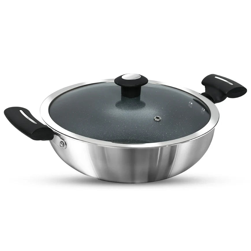 Impex, a brand hailing from India, presents a kitchen essential in the form of a 3-liter Kadai Pan. This sturdy cookware is expertly crafted from a combination of aluminum and stainless steel, ensuring both durability and even heat distribution. It comes complete with a glass lid, adding to its versatility. The non-stick interior of this Kadai Pan ensures that your culinary creations won't adhere to the surface, making for easy cleaning and hassle-free cooking.