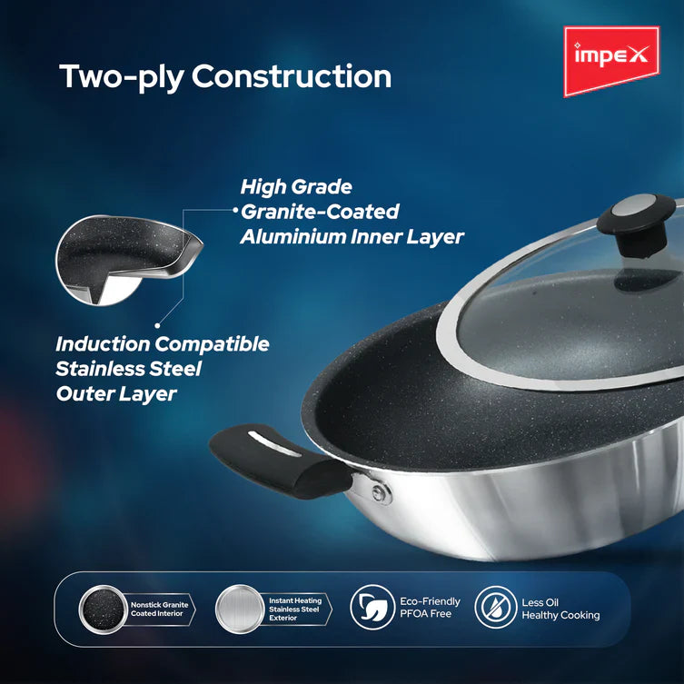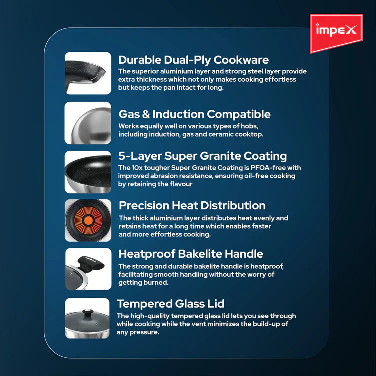 One of its standout features is the 5-layer granite coating, which is 10 times tougher than standard nonstick coatings, promising long-lasting performance even with daily use. Impex stands behind the quality and durability of this product by offering a 1-year domestic warranty. In the sales package, you'll find not only the Kadai Pan but also a glass lid, making it a versatile and valuable addition to your kitchen for various cooking needs. Whether you're frying, sautéing, or simmering, the Impex Kadai Pan is your dependable culinary companion.