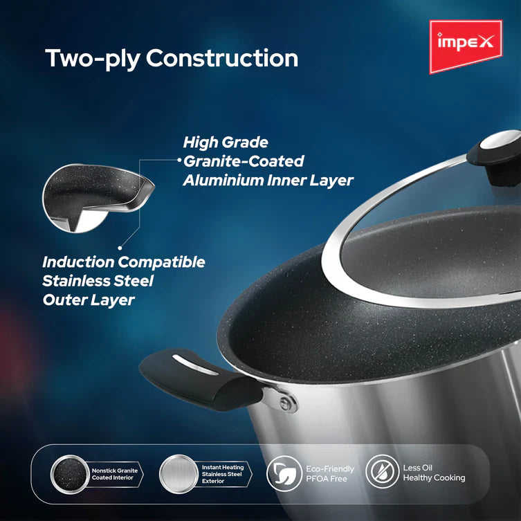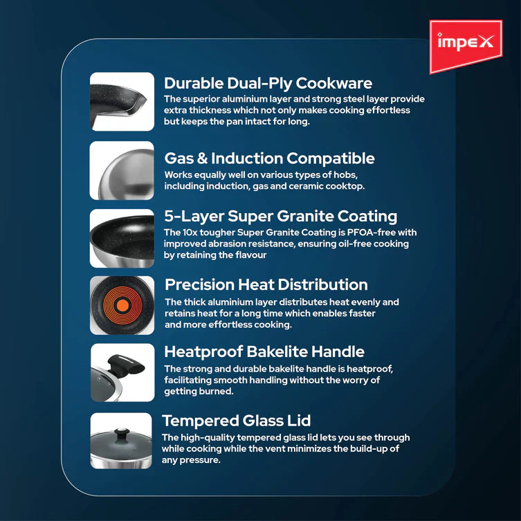 A key feature of this Sauce Pan is its 5-layer granite coating, which is 10 times tougher than standard nonstick coatings, promising long-lasting performance. Impex stands behind the quality of this product by offering a 1-year domestic warranty. The sales package includes one Sauce Pan and a glass lid, making it a valuable and versatile addition to your kitchen for various cooking needs. Whether you're preparing soups, sauces, or stews, the Impex Sauce Pan is your reliable and durable kitchen companion.