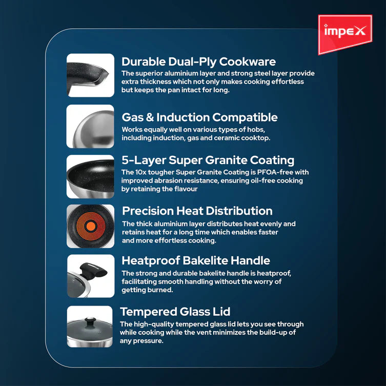 The Sauce Pan boasts a key feature in its 5-layer granite coating, which is 10 times tougher than standard nonstick coatings, promising outstanding performance and longevity. Impex stands by the quality and reliability of this product, offering a 1-year domestic warranty. The sales package includes one Sauce Pan and a glass lid, making it a valuable and versatile addition to your kitchen for various cooking needs. Whether you're preparing savory sauces, soups, or stews, the Impex Sauce Pan is your trusted and durable kitchen companion, ready to meet your culinary demands.